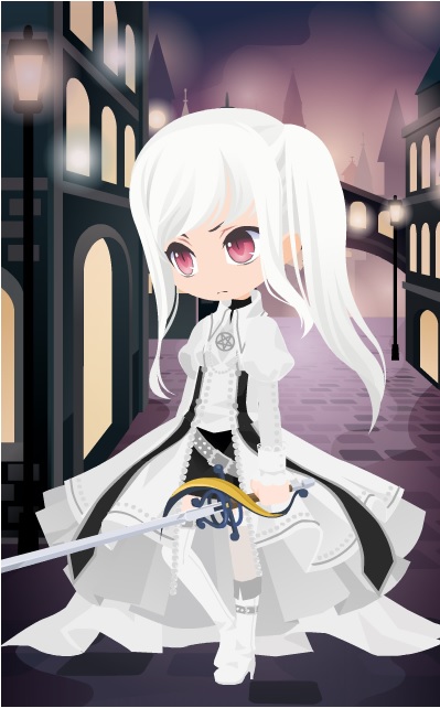 中には白のパニエ。同色のニーハイブーツ。白く大きなベルトに細剣を差している。